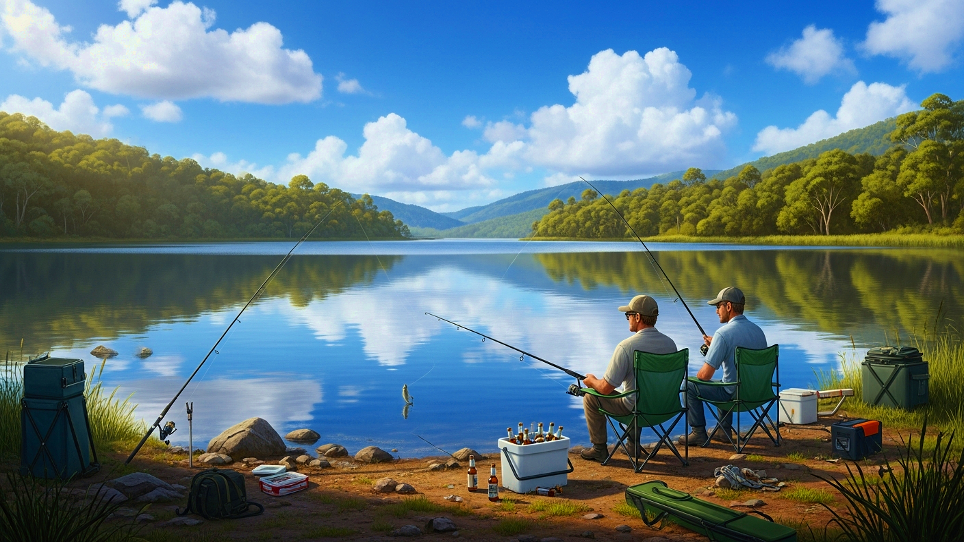 Two Brothers Fishing on a Serene Lake in Tasmania